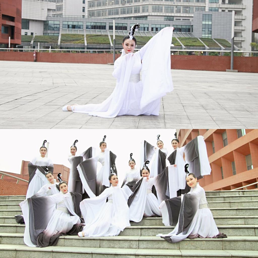 伴着婉转悠扬的古琴声一行舞者款款走来,清颜白衫,青丝墨染,白纻飘逸,若仙若灵,仿佛从梦境中走来。云袖轻摆,乐声萦绕于耳畔,飘忽若仙的舞姿,宽阔的广袖开合遮掩,更衬托出她们仪态万千的绝美姿容。走位轻盈翩若惊鸿,宛若游龙。笛声骤急,忽如间水袖甩将开来,裙摆飘飞,婉转流连,衣袖舞动流光飞舞,出尘如仙。一曲舞罢,傲世而立,白衣临风而飘,恍若仙子下凡,哀怨清雅。