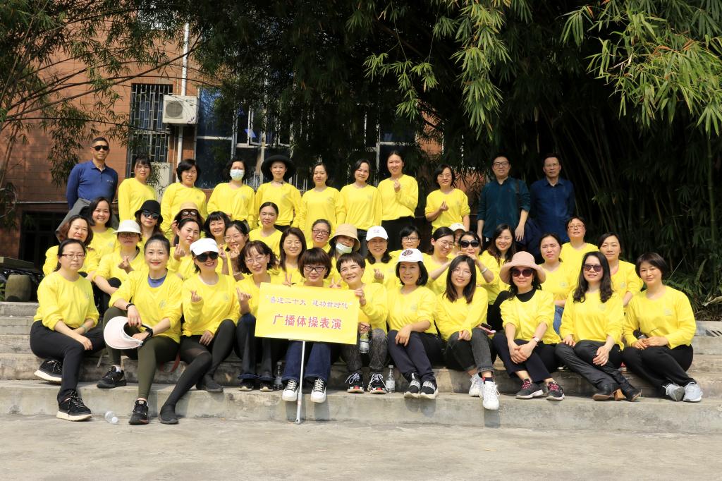 广播体操表演以分工会为单位,分为四个方阵参加。中午13:20,沐浴着温暖的阳光,参加广播体操比赛的老师们提前来到思群广场领取统一服装,站队训练。14:00,随着“全国第九套广播体操”的音乐响起,老师们昂首挺胸,开始表演。运动场上大家精神饱满,动作整齐,张弛有度,充盈着刚健之美,充分展示了外国语学院女教职工昂扬向上的精神风貌。