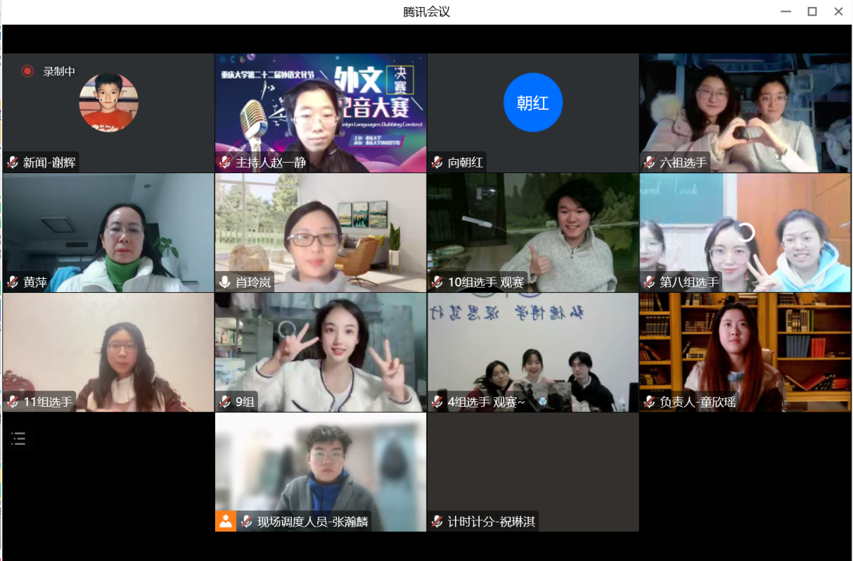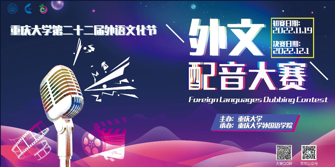 2022年12月3日14:00,重庆大学第二十二届外语文化节之配音大赛圆满结束。本次大赛由重庆大学主办、重庆外国语学院承办,分初赛、决赛两个赛段,每个赛段分英语专业组、公共外语组和日德组三个组别同步进行比赛。赛事自11月9日启动以来,吸引到全校近15个学院、29个专业的60支队伍前来参与,邀请到外国语学院英语系、大学英语课程组、日语系、德语系的专业老师担任各组别评委,各组别则按一定的比例晋级及获奖。