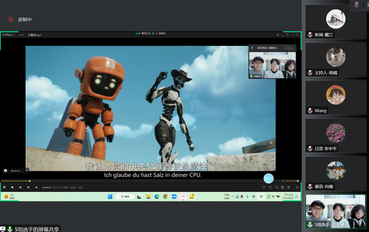 日德组的选手主要来自重庆大学外国语学院日语、德语专业。同时此次比赛还唤起了其他专业同学对小语种的兴趣,可喜可贺。他们的选材或恰当关注社会亲情类话题,重新唤起人与人之间对于情感的渴望;或着眼于对当今时代人类科技发展,体现对科技道德伦理的反思。在欣赏他们配音表演的同时,也带给观者对于个人、社会、国家三者关系的深入思考。