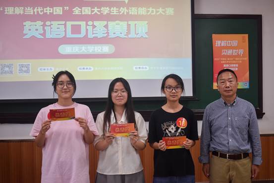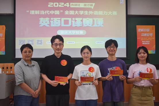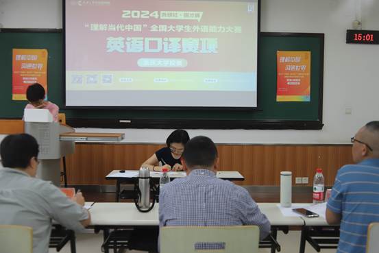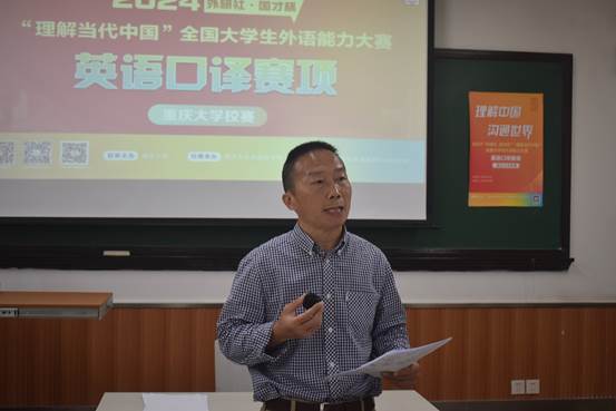 2024年6月13日下午14:30,2024“外研社·国才杯”“理解当代中国”全国大学生外语能力大赛英语组口译赛项校选赛在重庆大学虎溪校区综合楼DZ314进行,邀请到范定洪、陈毅强、甘霞等三位老师担任此次比赛的评委。本次比赛由重庆大学主办,重庆大学外国语学院承办,学生外语演讲与辩论协会协办。