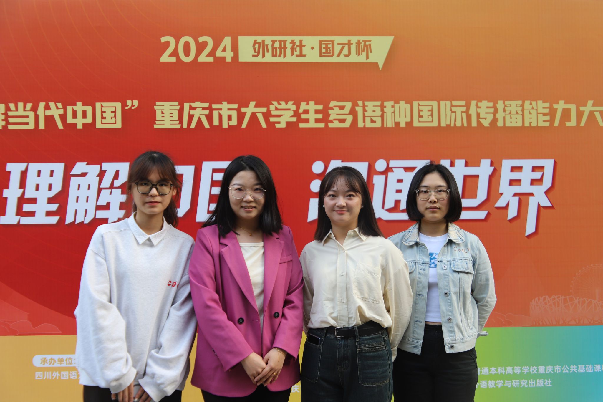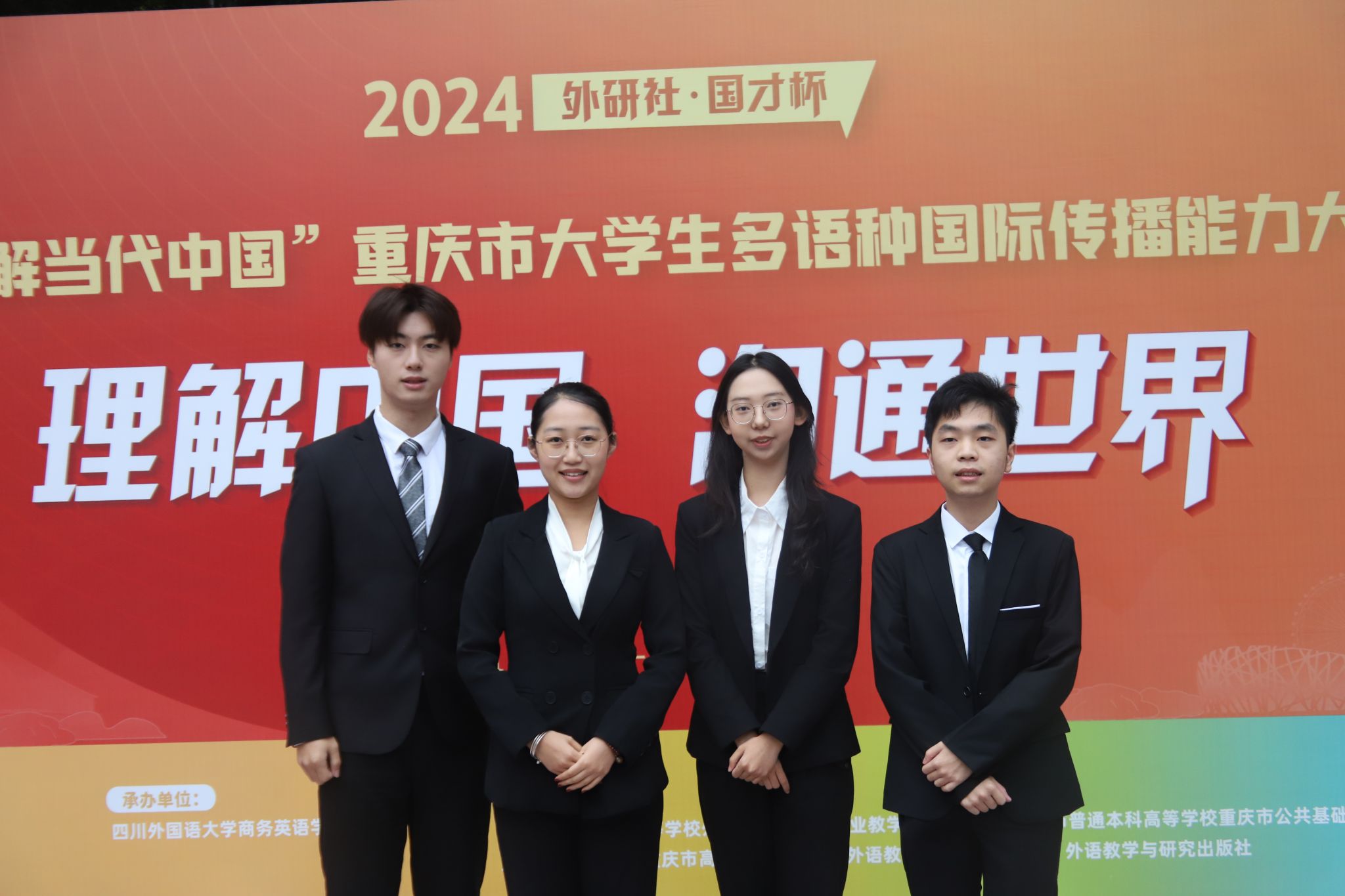 2024年11月2日-3日,2024“外研社·国才杯”“理解当代中国”重庆市大学生多语种国际传播能力大赛英语组系列赛项由四川外国语大学举办。我校5人晋级全国赛:外国语学院孙奕婷晋级英语演讲赛项国赛,外国语学院唐美怡、郑昭颖晋级英语口译赛项国赛,建筑城规学院孔馨怡、外国语学院张新伟晋级英语综合能力赛项国赛。