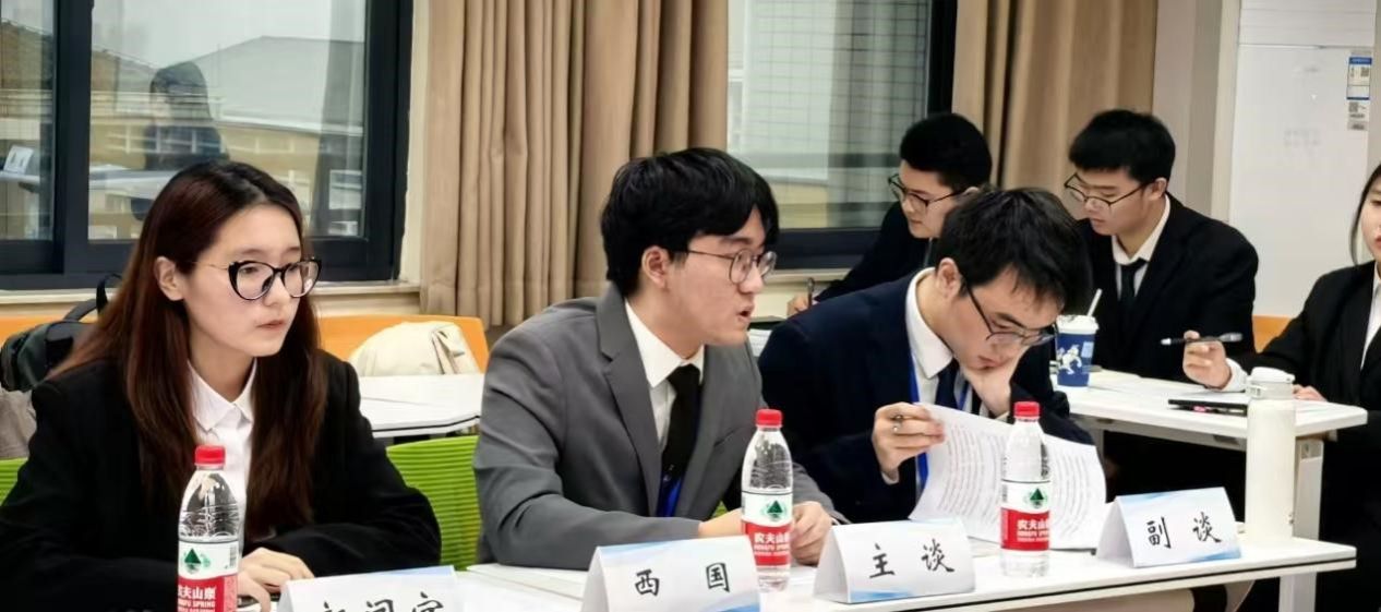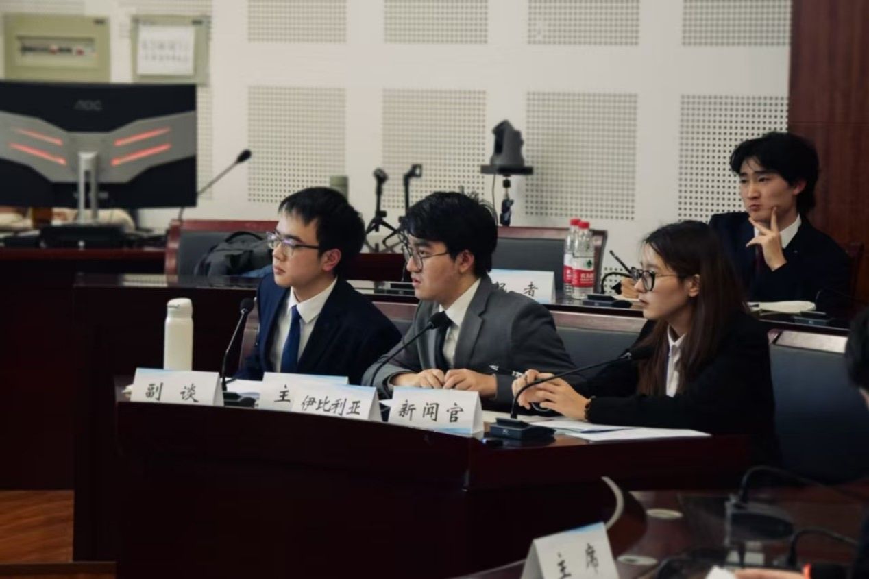 赛事分模拟双方会谈、模拟四方会谈、模拟三方会谈等三个阶段渐次推进。在激烈的模拟外交谈判中,作为主谈的胡宇翔同学坚定地维护己方的核心利益,敏锐洞察他方利益需求,真诚谋求合作以促进地区和平和发展,在复杂局势中坚守与破局。副谈判官王乾沣同学凭着对时机的巧妙把控、内容的及时补充以及异议的铿锵反驳,为谈判的顺利推进续航助力。新闻官张博雅同学完整准确地对谈判所达成的各项成果进行梳理与归纳,大方得体、严谨缜密地铺陈我方的观点,机敏回应他方记者尖锐问题,夯实我方立场。记者徐晗同学细致捕捉他方话语逻辑漏洞,在立场陈述和新闻发布会的记者问答环节据理力争,筑牢话语防线。