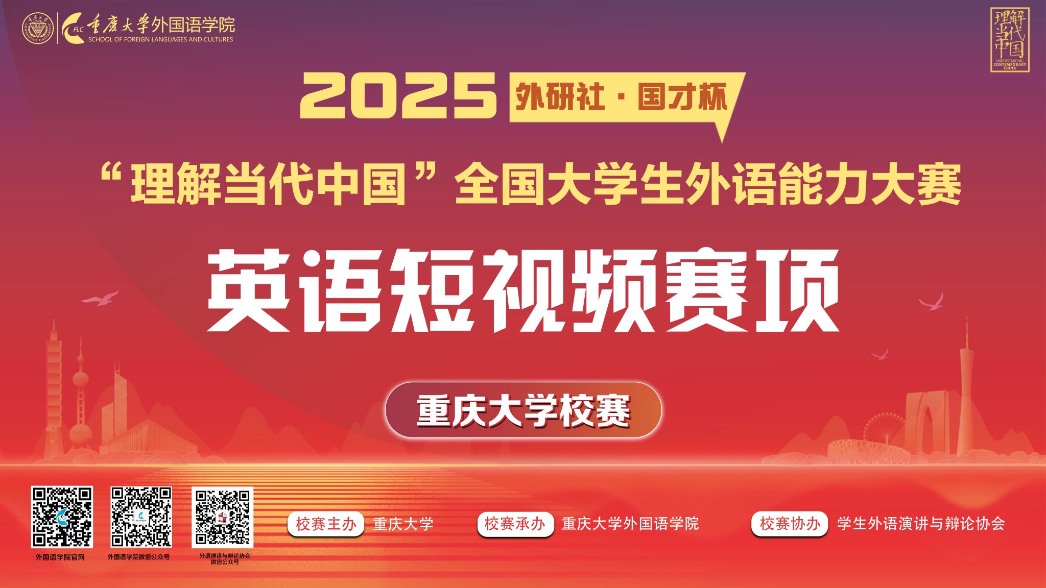 近日,2025年“外研社·国才杯”“理解当代中国”全国大学生外语能力大赛短视频(英语)赛项校赛结束。本次赛事由重庆大学主办、重庆大学外国语学院承办、学生外语演讲与辩论协会协办,吸引了全校26个学院近50个专业(类)各年级的77个团队和个人参赛。