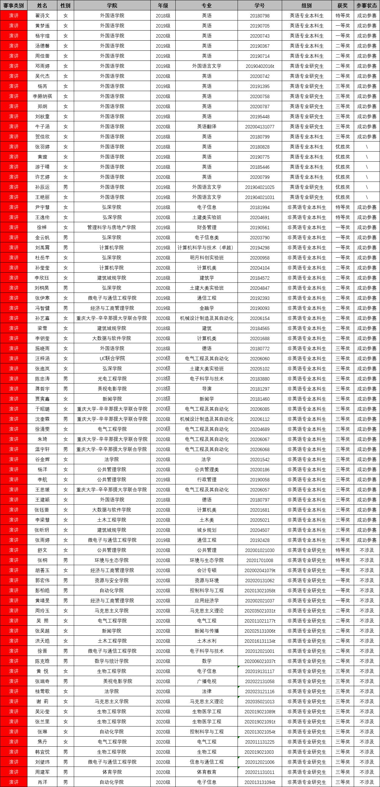 赛事选拔历时一个月,最终评定出253名获奖选手。其中,英语专业组获奖选手共87人,本科生获奖54人,研究生获奖33人;非英语专业组获奖选手共166人,本科生获奖79人,研究生获奖87人。具体获奖人数详情如下表: