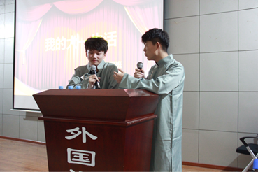 2021年7月18日晚19:00,外国语学院2020级学生在外国语学院楼二楼多功能厅举办了学生手册成果汇报展演活动,以六个班级为单位呈现六个短剧节目。主持人吴桐和张轶上场致辞,活动正式开始。