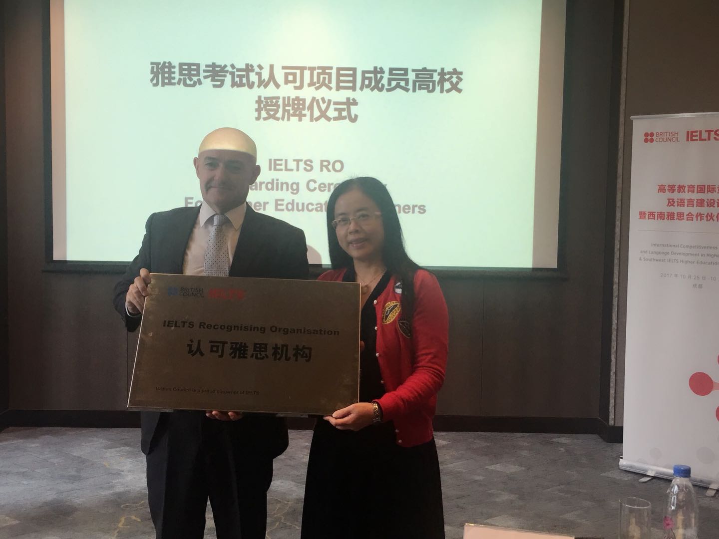 2017年10月25日由英国文化教育协会(雅思考试主办方)举办的“高等教育国际竞争力及语言建设论坛暨西南雅思合作伙伴院校大会”在成都召开,来自西南地区30多所高等院校的80余名领导和教师共同参加了本次会议。会议分享了高校国际化探索经验,以及引入雅思、普思考试对高校英语语言建设所产生的积极影响。会议席间,英国文化教育协会为重庆大学、西南财经大学和四川师范大学三所高校举行了“认可雅思机构”的授牌仪式。我院副院长(主持工作)彭静教授、培训中心主任张科代表学院接受了“认可雅思机构”的授牌。