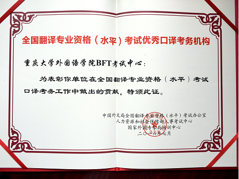 大会对翻译专业资格(水平)考试优秀考务机构进行了表彰,重庆大学外国语学院BFT考试中心等5家单位荣获“优秀口译考务机构”荣誉称号,领导对我院BFT考试中心的考务工作给予了高度评价。