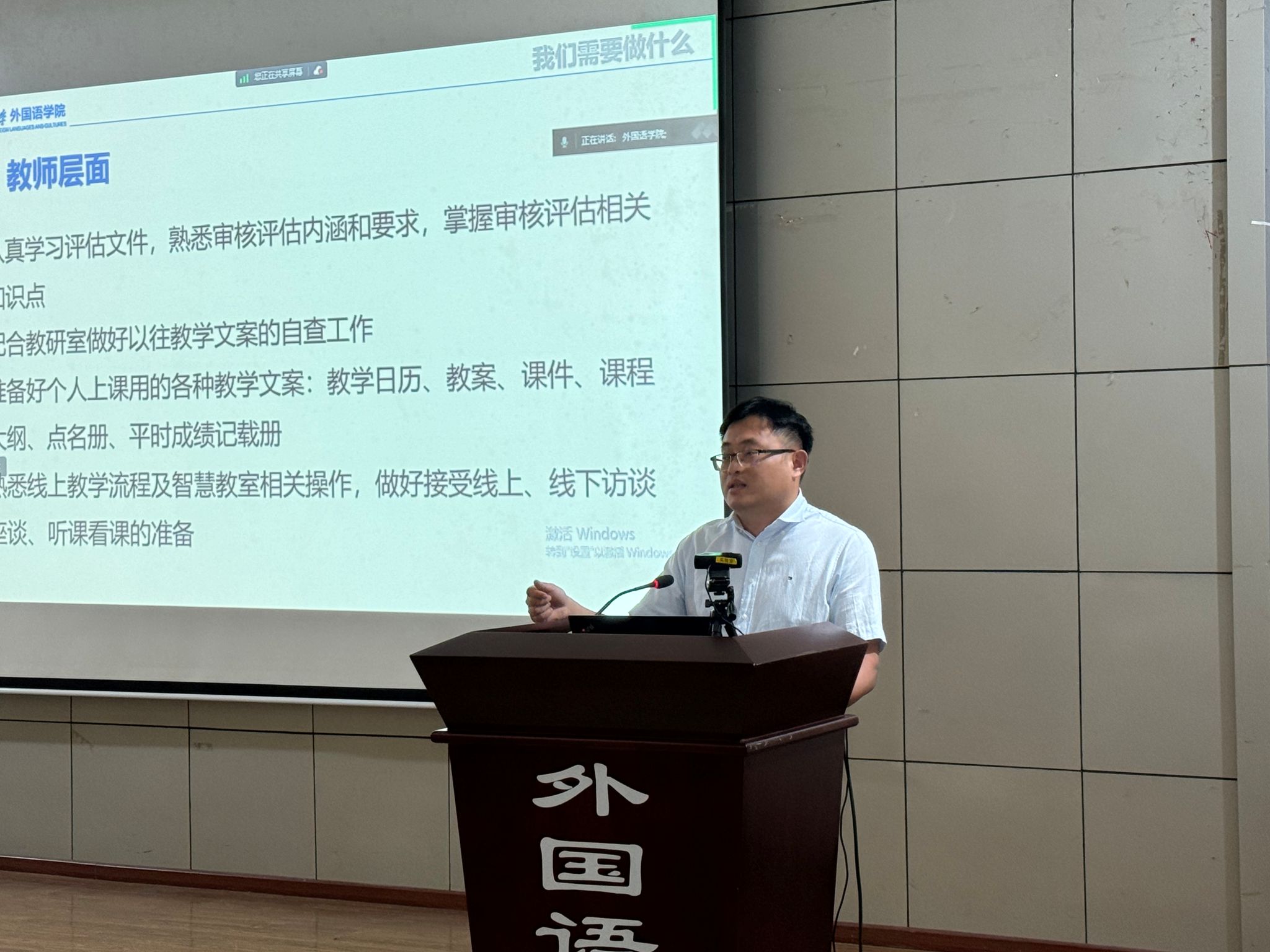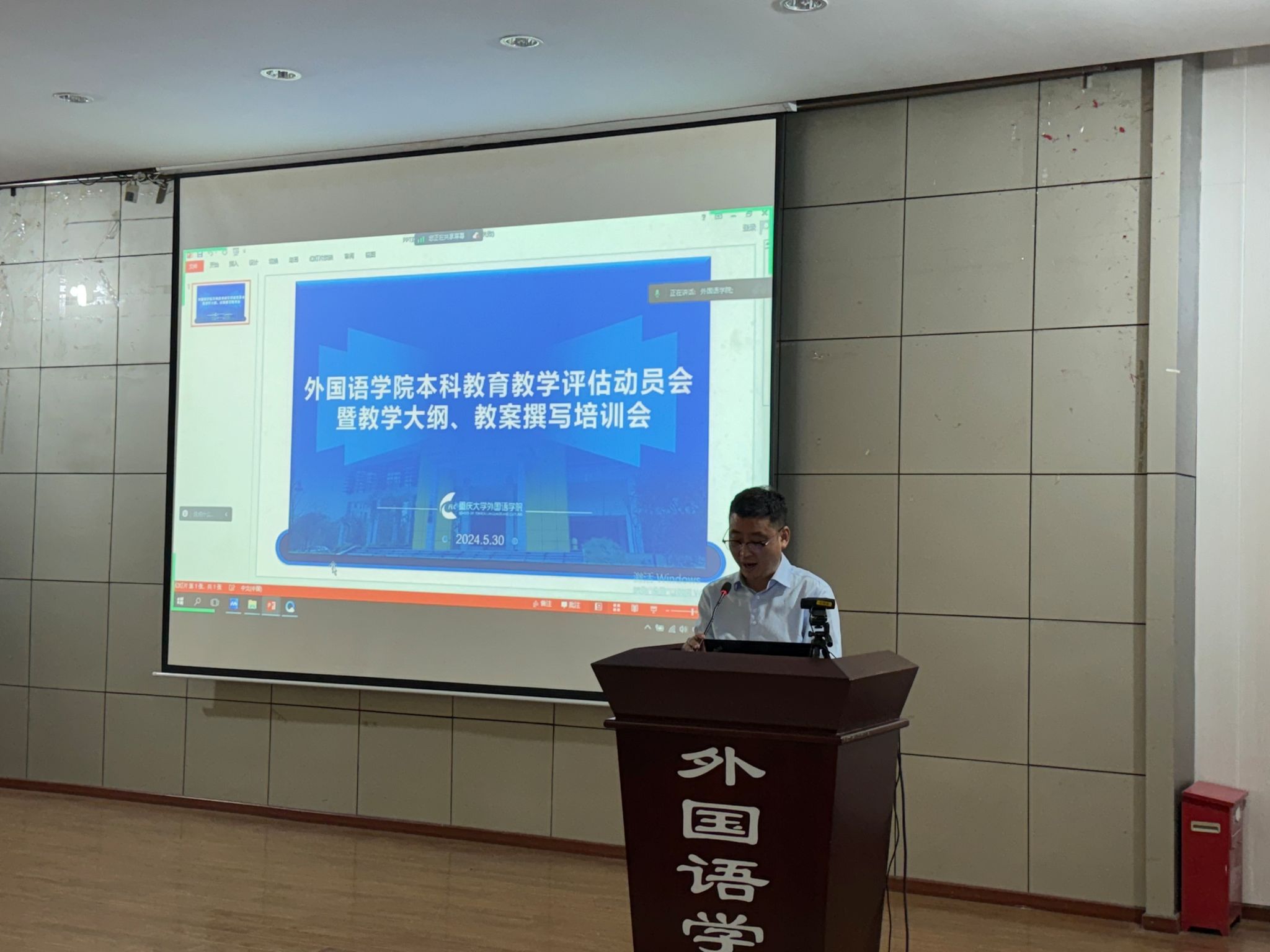 为深入贯彻落实教育教学审核评估精神,确保学院教学质量持续提升,外国语学院于5月30日下午在学院多功能厅召开了本科教育教学审核评估动员会。本次会议由王江副院长主持,欧玲书记、莫启扬院长、李小辉副院长、刘扬副院长、全体任课教师以及教学管理人员参加了此次会议。会议特别邀请了重庆大学教师教学发展中心的陈圆副教授和西南大学褚修伟教授分别就教案和教学大纲撰写进行了深入讲解。
