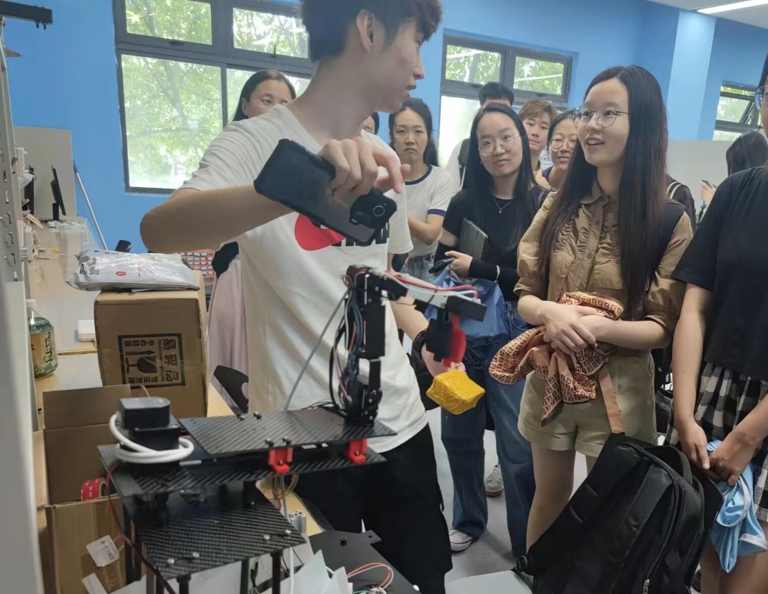 在3D打印间,同学们近距离观察了先进的三维打印技术,了解了它在制造领域的广泛应用。在木工坊,同学们探索了木材加工的工具和艺术与工程的交叉结合。在智能汽车实验室,同学们更深刻地了解了车辆技术的发展和魅力。而在参观制造中心、工程培训中心和无人机实验室的途中,来自外国语学院的同学们有幸偶遇了专业知识坚实的理工科同学,在他们的耐心解说下,翻硕同学们对多种仪器的设计思路和应用有了更加清晰的认识。
