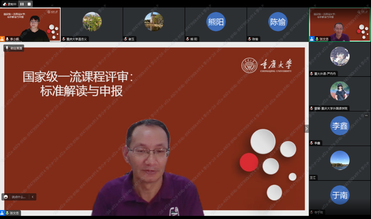 2023年6月15日,重庆大学外国语学院特邀请教育部学科研一体化外语教学研究虚拟教研室负责人、南开大学张文忠教授为学院各专业系、大学外语教育中心课程负责人及骨干教师做了一场一流课程建设专题讲座。外国语学院60余名课程负责人、骨干教师参加了讲座。此场讲座由李小辉副院长主持。