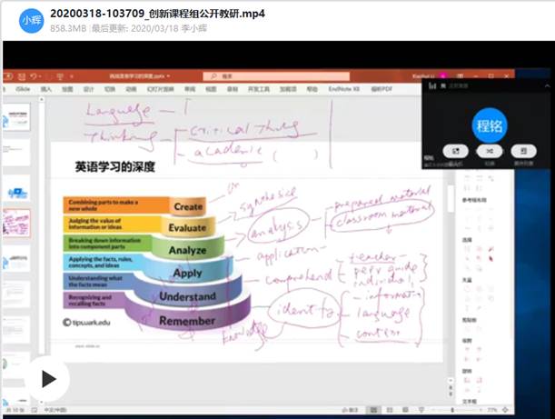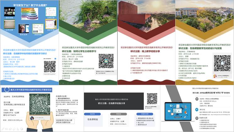 为了进一步保障线上教学质量,大学外语教育中心以课程组为单位,展开了为期3周的线上公开教学研讨活动, 大学英语学业素养系列课程、学术素养及职业素养系列课程以及公共研究生英语系列课程共举办面向社会开放公开教研活动7场,同系列课程研讨活动20余场。学院领导、教学督导委员会教授、大学外语教育中心各课程组教师、语言语音实验教学中心教师等通过钉钉、QQ群视频、腾讯会议等平台参与了系列教研活动,共计600余人次。教研活动紧紧围绕线上外语教学实践和研究,重点探讨了在线深度学习、在线课堂互动设计、基于SPOC的在线翻转教学、在线“教”与学生“学”的有效性等话题,教师们各抒己见、与大家共同分享在线教学策略与设计,专家教授及时答疑解惑,旨在进一步探索有效线上教学模式,提高线上教学效果。